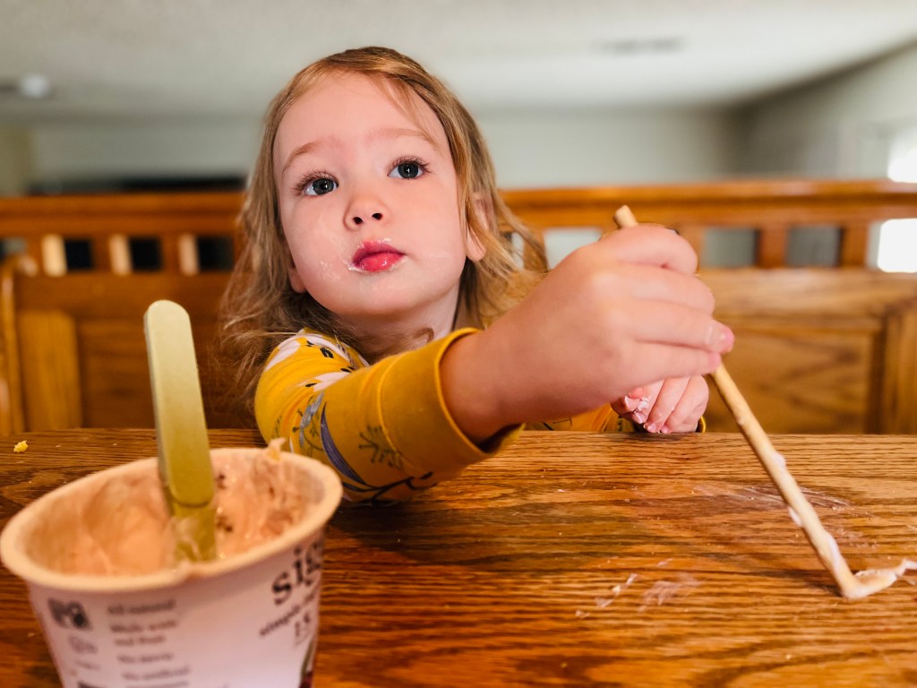 she sits forward, kneeling to dip a powdered piece of puffed pirate booty into a cup of thick strawberry skyr. just forty years ago the choice was government cheese or powdered milk; it’s not a wonder i went without, often. nothing good comes from bricked cheese that reeks of its cardboard box and plastic or milk that requires water and stirring. ‘snack time!’ she sings. she’s happy now, loves food in all sorts of strange and unexpected configurations: scrambled eggs dipped in florida orange juice, crispy coconut shrimp drug through muddy puddles of ketchup and steak; lots and lots of tiny, thinly sliced pieces of perfectly seasoned colorado beef. right now, she’s dragging a limp bamboo straw first through her yogurt and then across her teeth and tongue- it isn’t enough to taste the food, benefit from its caloric index, she wants to feel it.. thick on her lips, dusty there in her soft hand, between her fingertips. and why shouldn’t she? be a child, let to experience more than just one breath of her existence. the bamboo straw has transformed into a paint brush- dipped first in the pale pink palette of her curdled milk and then smeared gently across the surface of her powdery puff. she hums softly now, a song about a t-rex she knows